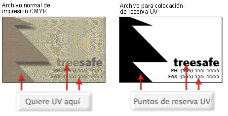 Al crear un arte con reserva UV, usted debe incluir un archivo de plantilla de reserva UV junto con el archivo a todo color. El archivo de plantilla de reserva UV se utiliza para mostrar donde se colocara esta reserva. Todos los trabajos con reserva UV se les colocara laminado mate para que la colocación de reserva UV se destaque más sobre el trabajo.