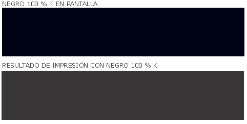 Negro es una rica mezcla de tinta negro sólido, 100% K, con tintas de valores CMY. Esto resulta en un tono más oscuro que la tinta negra sola. Si imprime solo negro como 100% K, el negro resultante puede no ser tan oscuro.