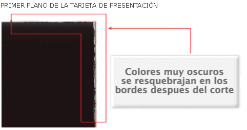 Resquebrajamiento de los bordes de una tarjeta de presentación a veces se produce cuando la tarjeta contiene altos valores de tinta, como en colores oscuros.