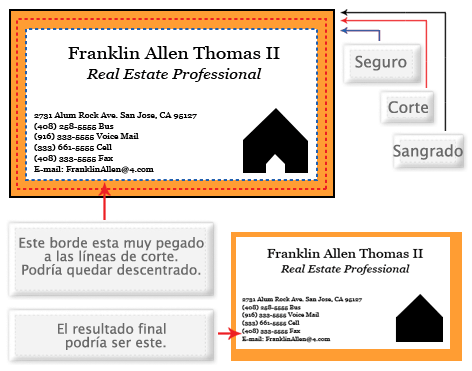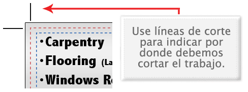 El sangrado debe extenderse más allá de la línea de corte. Usando una de nuestras plantillas (templates) le puede ayudar a visualizar esto. Por favor, tenga todo el texto y todo lo que no quiere cortar por lo menos 3 mm. por dentro de la línea de corte.